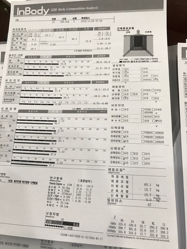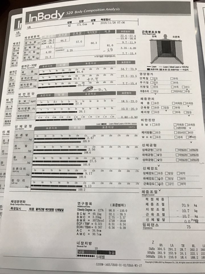 üÁß(kg) 83.4 => 81.6 ==> -1.8 °ñ°Ý±Ù·®(kg) 34.3 => 34.5 ==> + 0.2 üÁö¹æ·®(kg) 23.5=> 21.3 ==> -2.2