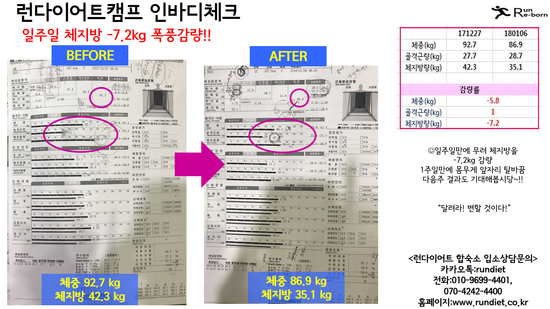 ù¹øÂ° ü¼ººÐ ÃøÁ¤ °á°ú ȸ¿ø´ÔÀº 1ÁÖÀϸ¸¿¡ ..!!¹«·Á üÁö¹æÀ» -7.2kg °¨·®ÇϽŠȸ¿ø´ÔÀÔ´Ï´Ù!! 1ÁÖÀϵ¿¾È üÁö¹æ -7.2kg °¨·®, °ñ°Ý±ÙÀº 1kg »ó½Â üÁßÀº -5.8kg °¨·® ÇÏ½Ã¸é¼ Ã¼ÁßÀº 92.7 kg => 86.9 kg °ñ°Ý±Ù 27.7 kg => 28.7kg üÁö¹æ 42.3 kg => 35.1 kg ·Î º¯½ÅÇϼ̴ä´Ï´ç~~! ´ÙÀ½ÁÖ °á°úµµ ³Ê¹«³Ê¹« ±â´ë°¡ µÈ´Ù±¸¿ä>¤·<