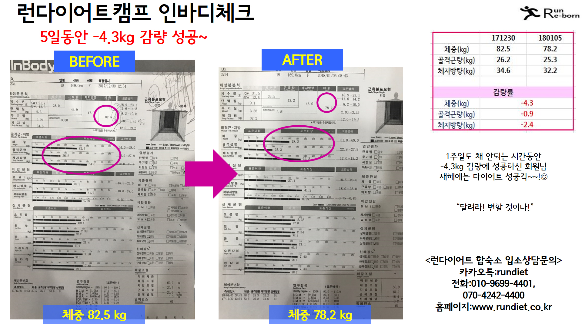 ¸¶Áö¸· ü¼ººÐ ÃøÁ¤ °á°úÀÔ´Ï´Ù:) ȸ¿ø´Ô²²¼´Â 1ÁÖÀÏÀÌ Ã¤ ¾ÈµÇ´Â 5Àϸ¸¿¡ ÃøÁ¤À» Çϼ̴µ¥¿ä~ 5Àϸ¸¿¡ ÃøÁ¤ÇÑ °á°ú´Â ¹«·Á!! üÁß 82.5 kg => 78.2 kg: ÃÑ -4.3kg °¨·® ¿¡ ¼º°øÇÏ½Ã¸ç ¸ö¹«°Ô ¾ÕÀÚ¸® Å»¹Ù²Þ¿¡ ¼º°ø:)