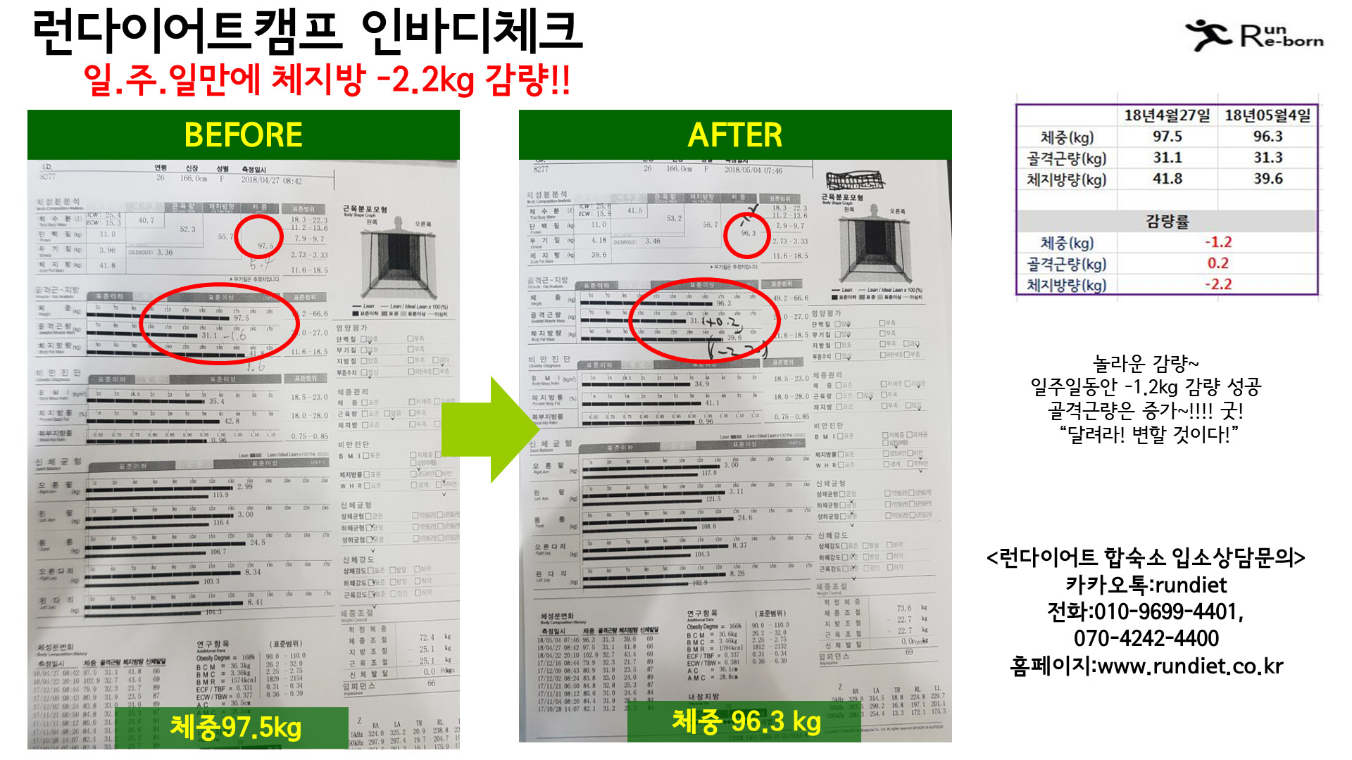 À̹øÁÖ ¸¶Áö¸· ¿ì¸® ·± ´ÙÀÌ¾îÆ®Ä·ÇÁ ȸ¿ø´ÔÀÇ Ã¼¼ººÐ ÃøÁ¤ °á°úÀÔ´Ï´å~!!!! ¤¾¤¾ ÀÏÁÖÀÏÀ̶ó´Â ½Ã°£µ¿¾È ¹Ýº¹µÇ´Â ¿îµ¿,ÀûÀº ½Ä»ç·®Àº Èûµå½Ç¹ýµµ Çѵ¥ ÆÄÀÌÆÃ ³ÑÄ¡´Â ¸ð½Àº¸¸é ÁøÂ¥ Á¸°æ½º·¯¿ö¿ä! À̹ø ȸ¿ø´Ôµµ Ç×»ó ÆÄÀÌÆÃ ³ÑÄ¡°Ô ¿½ÉÈ÷ Çϴ ȸ¿ø´ÔÀε¥¿ä ¤¾¤¾ ±×·¡¼ À̹ø Àιٵð °á°úµµ ÁÁÀº°Í°°³×¿ä~!! ÀÏÁÖÀ̶ó´Â ½Ã°£µ¿¾È üÁö¹æ -2.2kg¿¡ °¨·® ¼º°øÇϼ̾î¿ä~! ¿©À¹½Ã~~~ ¿ì¸® ·± ´ÙÀÌ¾îÆ®Ä·ÇÁ ȸ¿ø´Ô´ä°Ô ±Ù¼Õ½ÇÀº ¾î¿ï¸®Áö ¾Ê´Â´Ù~!!! ±ÙÀ°·®Àº Áõ°¡ÇÑ »óÅ¿¡¼ üÁö¹æ¸¸ °¨·® ¼º°øÇϼ̽À´Ï´Ù~~^^ üÁö¹æ 41.8¿¡¼ 39.6À¸·Î ¾ÕÀÚ¸® ¹Ù²Ù½Ã´Âµ¥ ¼º°ø~~!!!